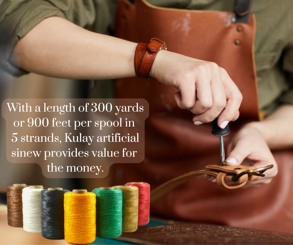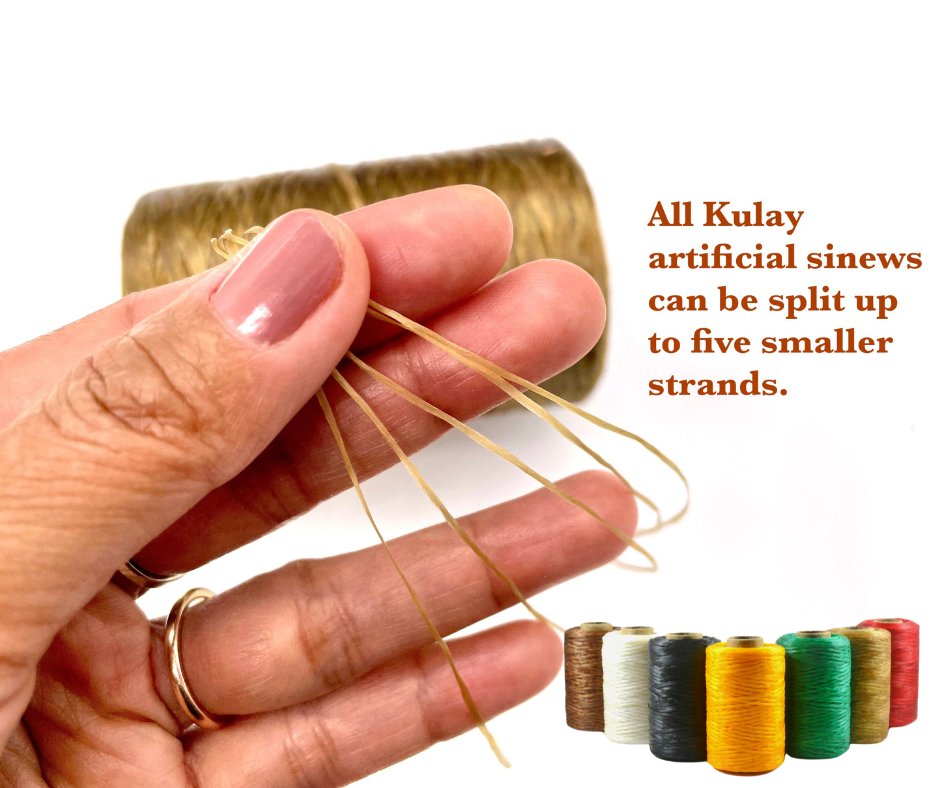 Kulay (pronounced as coo-lī) is a high-quality artificial sinew perfect for your projects that require a strong and sturdy thread, such as, pine needle baskets, loom work, dream catchers, stringing chokers and necklaces, knife handles, leather projects, tie-dye, general sewing, and more. It is lightweight, flat like a ribbon, and does not stretch.